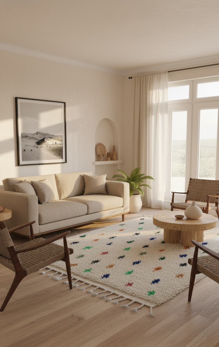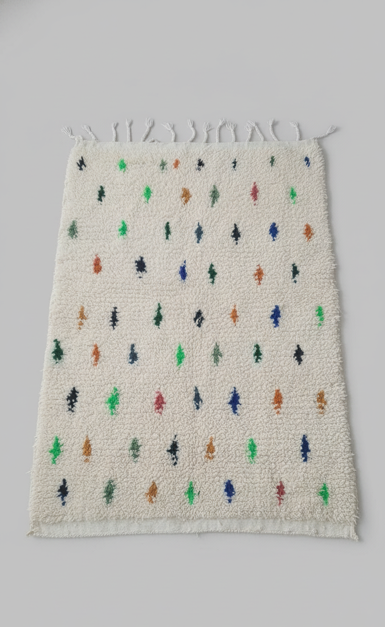 Forest Dot est un tapis marocain à l’esthétique douce et poétique, inspiré par la nature et les forêts de l’Atlas.