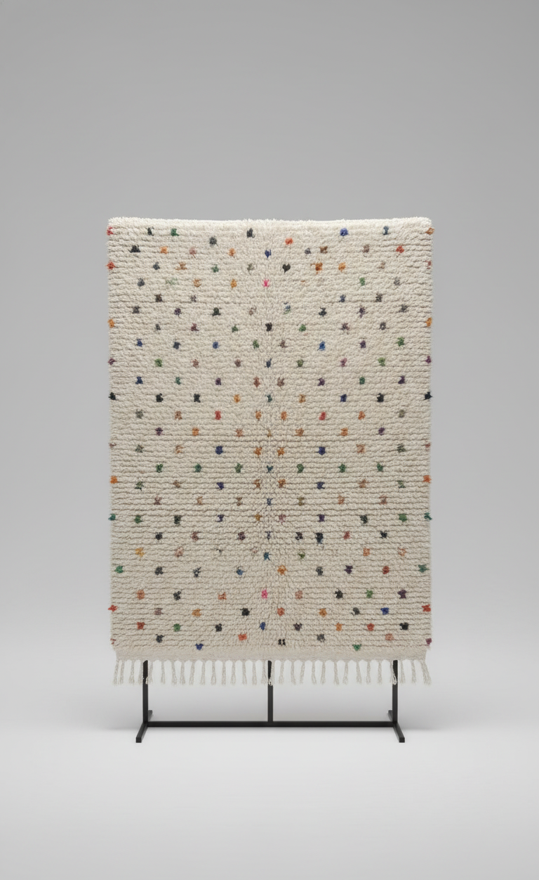 Sur une base blanche naturelle, de petits points colorés multicolores sont délicatement répartis, comme des éclats de couleurs semés à la main, donnant au tapis une énergie positive et contemporaine tout en restant élégante.