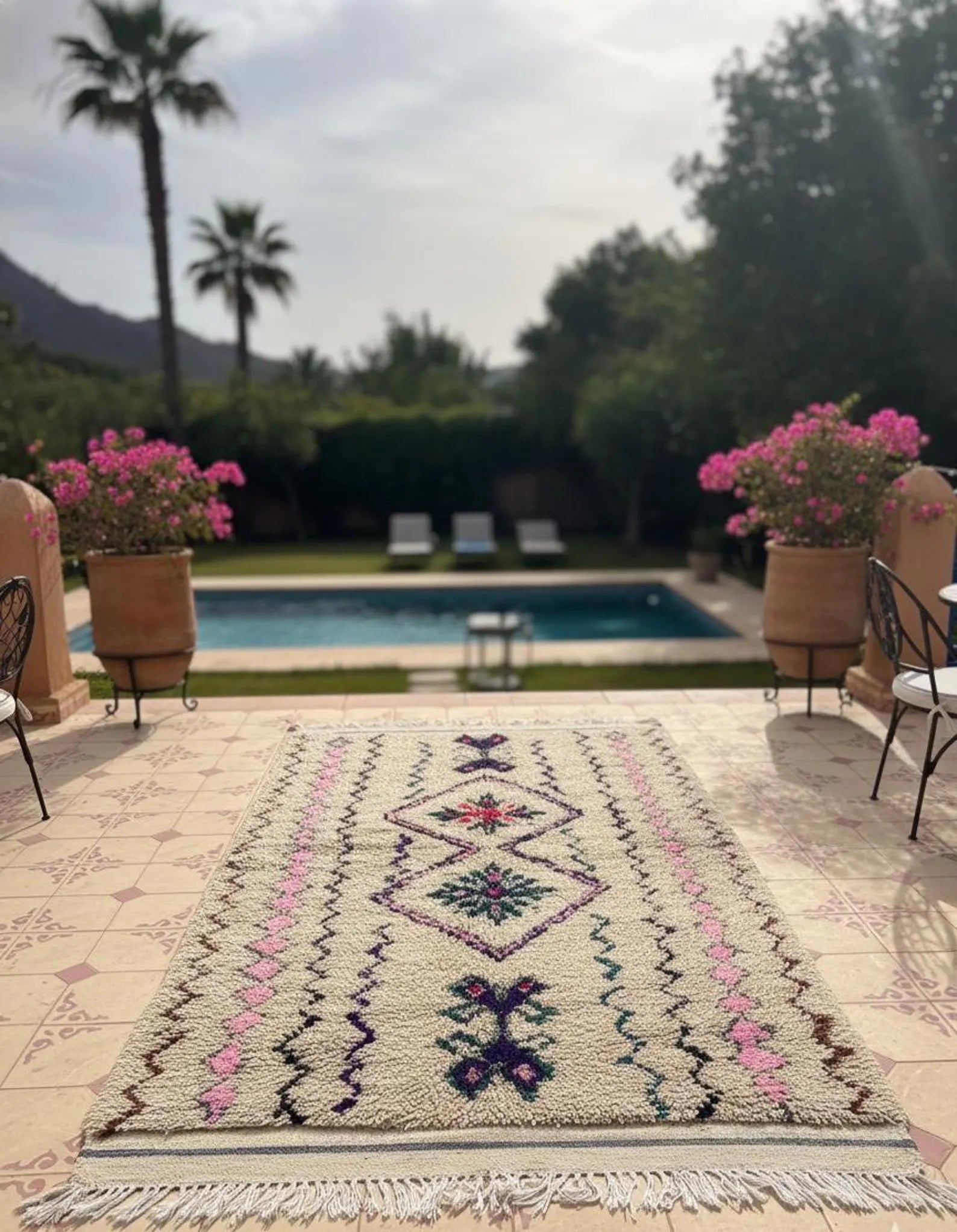 Son fond beige chaleureux est orné de symboles tribaux multicolores et de lignes géométriques inspirées de l’héritage amazigh une véritable expression artistique des femmes berbères rurales.