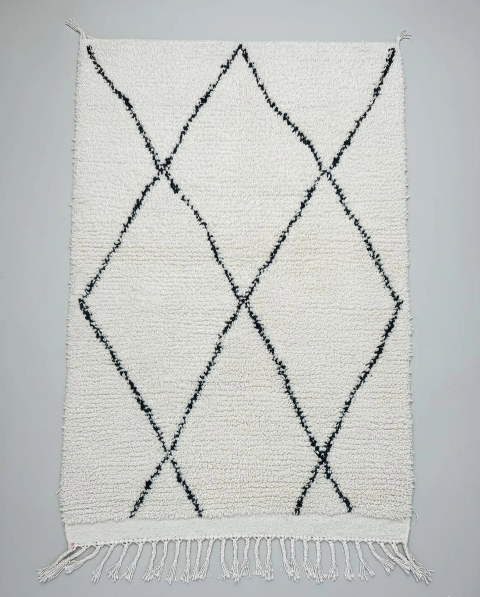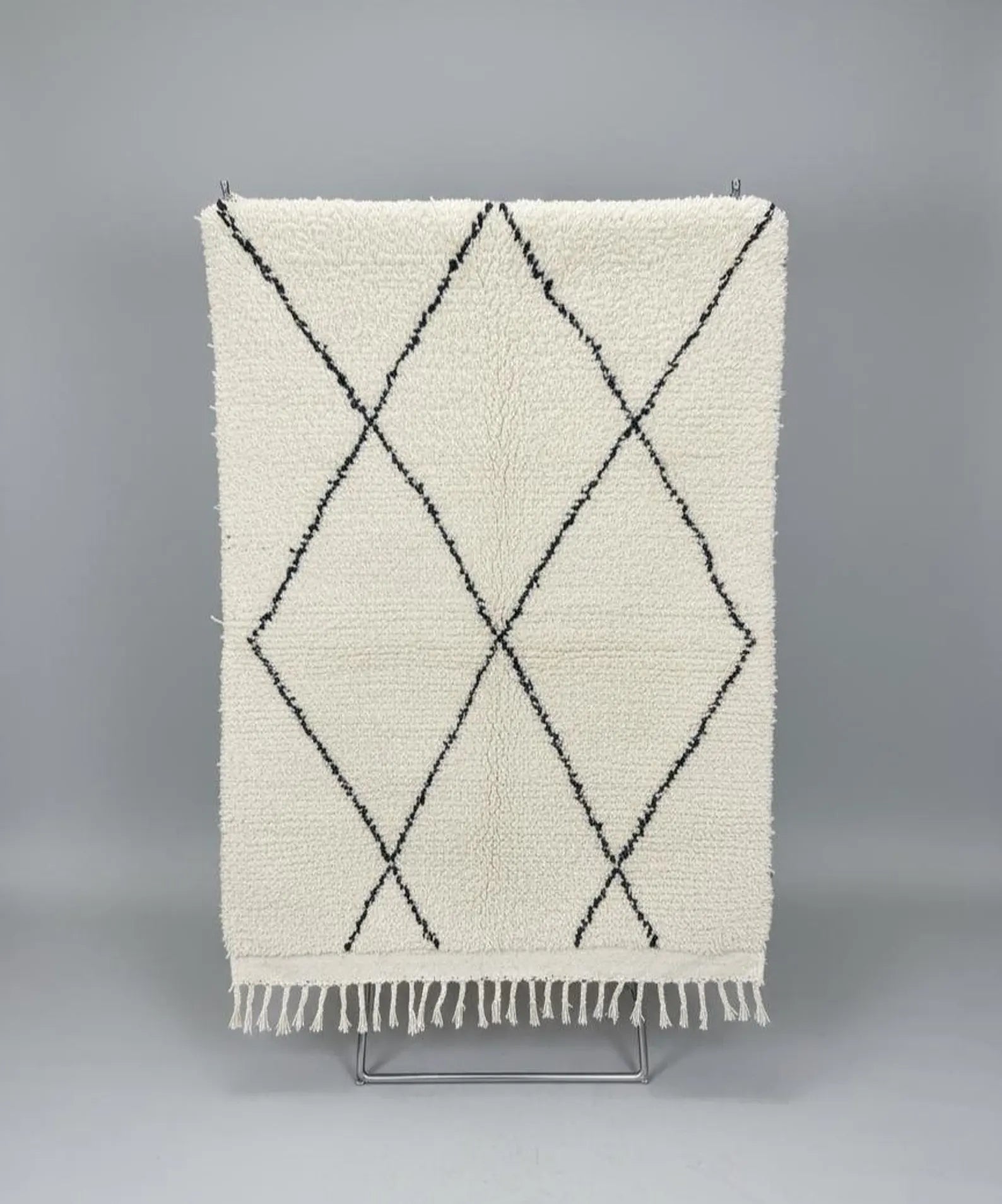 Minimalisme Noir & Blanc : Lignes simples et élégantes formant des losanges en forme de X l’identité classique des tapis Beni Ouarain.