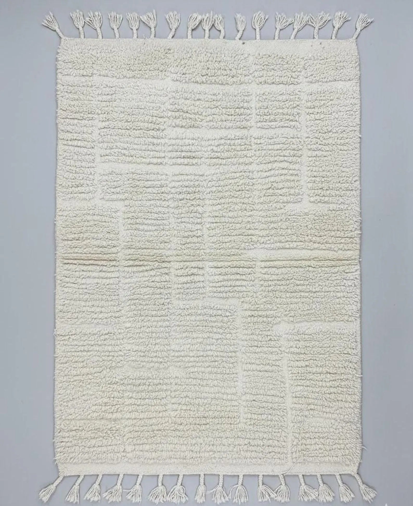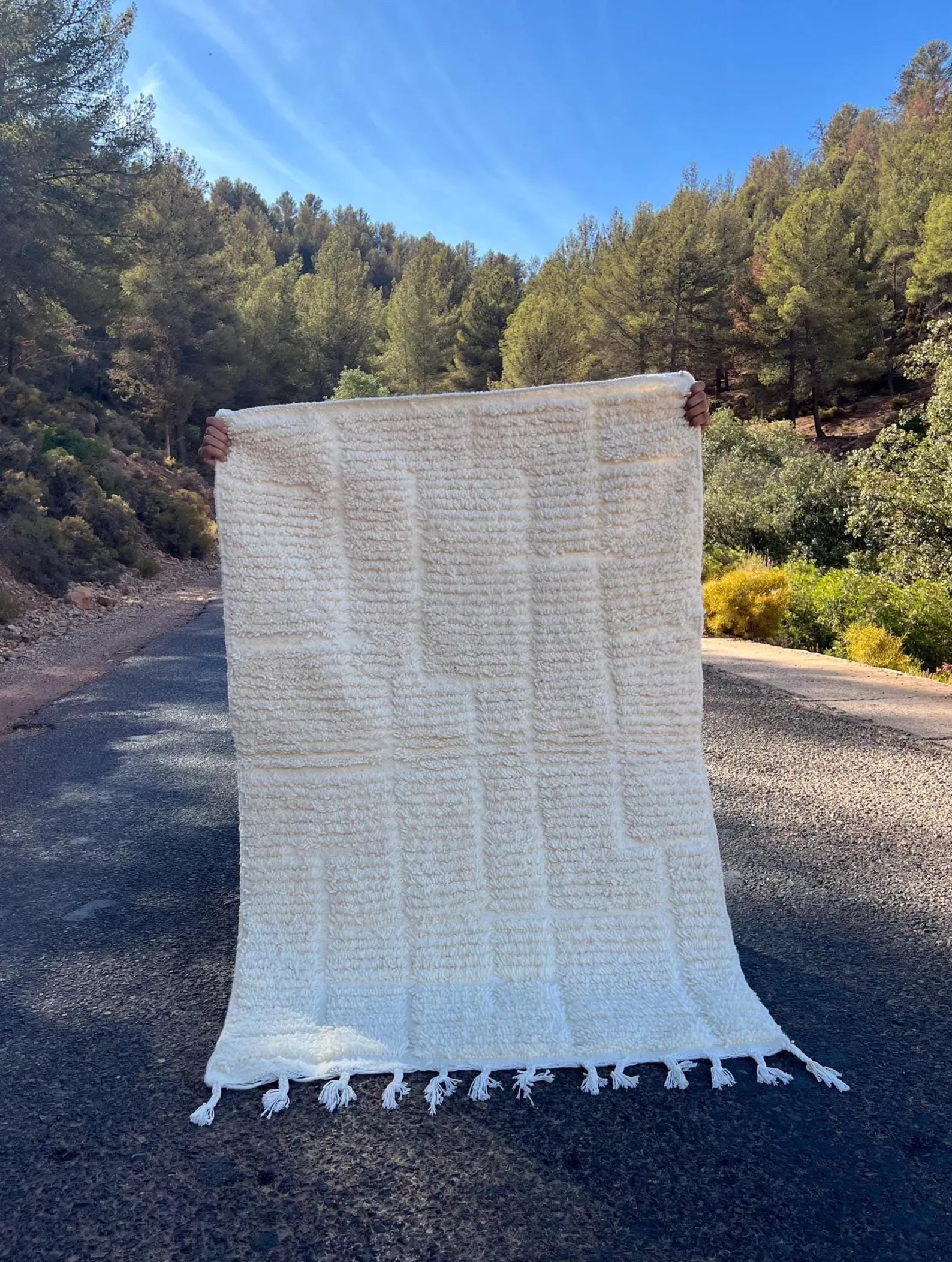 Le résultat : un tapis blanc texturé d’une grande finesse, ressemblant à une œuvre d’art abstraite moderne tout en restant profondément ancré dans le savoir-faire amazigh.