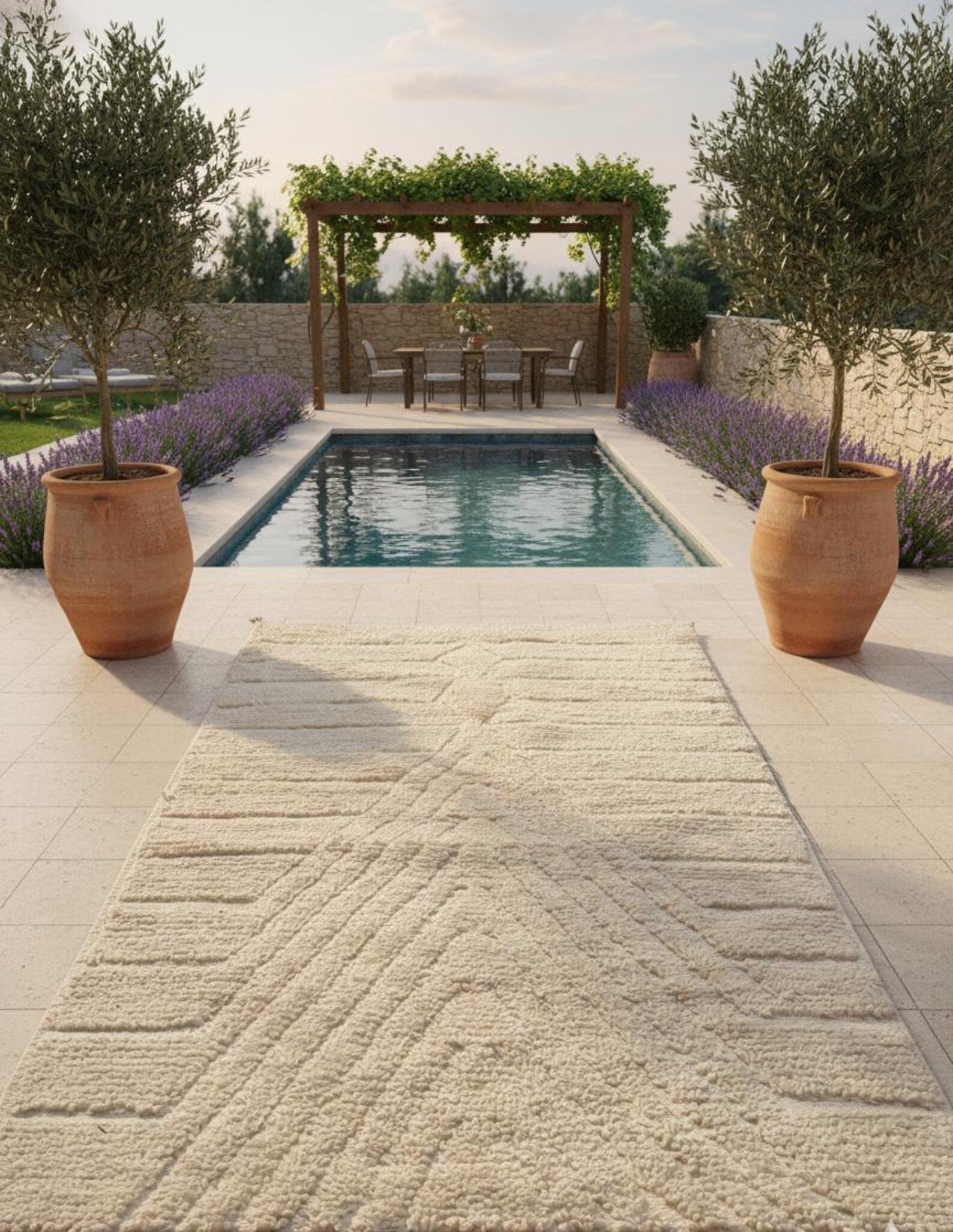 Sa surface présente un motif géométrique sculpté à la main, réalisé avec précision par une artisane marocaine expérimentée — un design artistique né de l’imagination de la tisseuse.