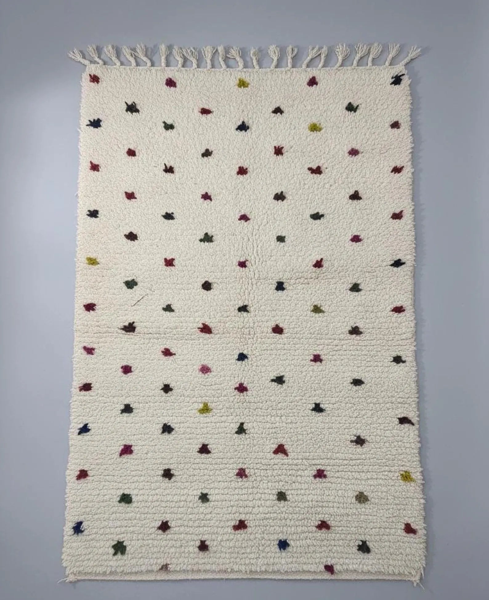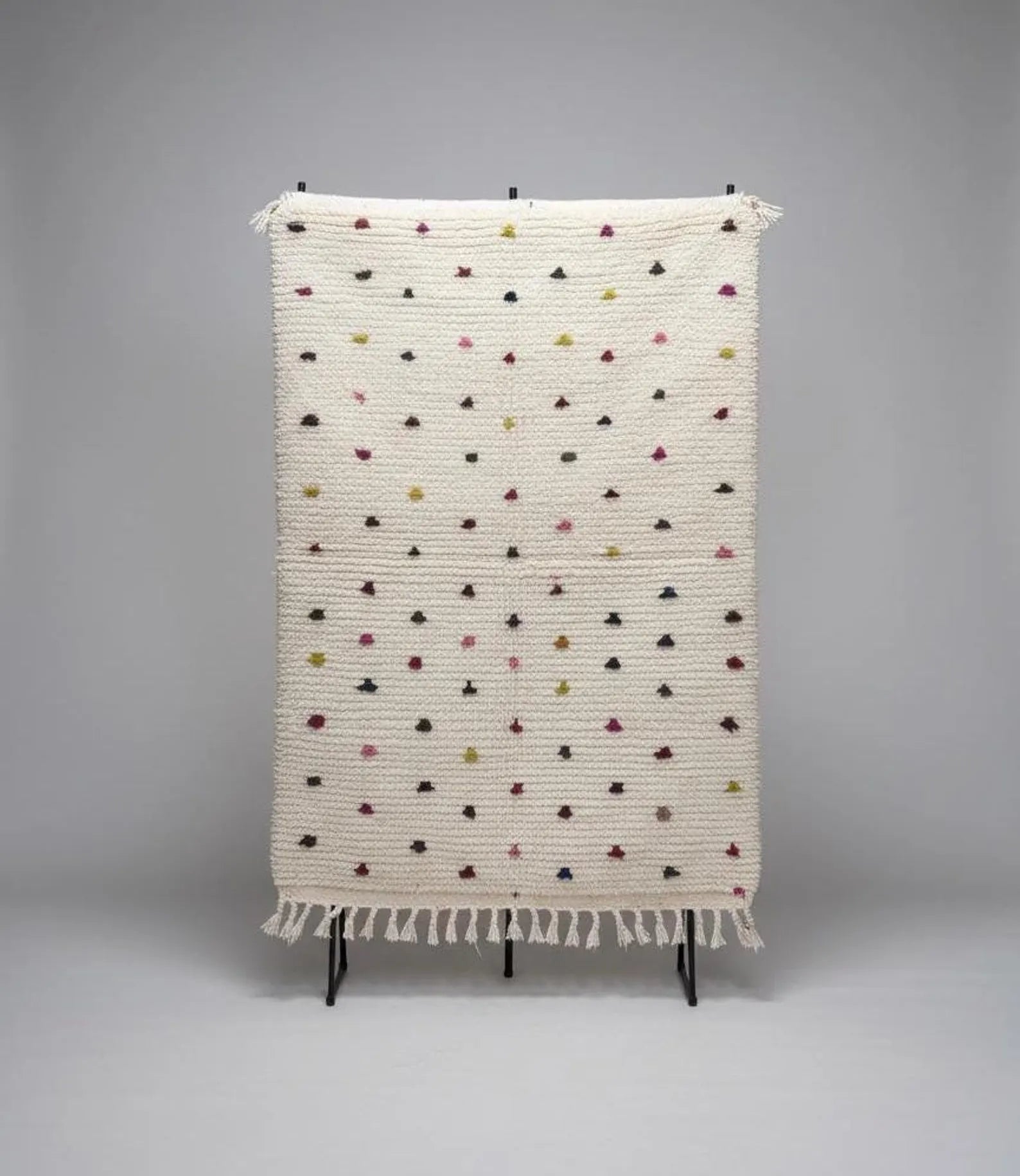 Motif moucheté multicolore : Fond blanc orné de petits points colorés noués à la main unique, ludique et plein de vie.